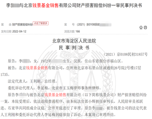 此外,诉讼中,李某某还提交了证监会北京局2021年12月2日200号文件,该文件载明:“北京钱景基金销售公司:经查,你公司在销售业务开展过程中,存在向不特定对象宣传推介私募基金、与全资股东混同经营、内部控制不健全且未对基金销售业务的合规性进行有效监督、与不符合监管部门资质要求的机构合作开展私募基金销售、未能妥善保存投资者适当性管理相关资料等问题。上述情形违反了……,我局决定对你公司采取责令改正并暂停办理公募基金及其他金融理财产品销售业务6个月的行政监管措施。”