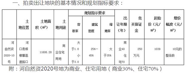 该宗土地编号为“河自然资2020-10号”,位于河口县槟榔寨高速路口,土地用途为商业和住宅用地,商业用地为30%、住宅用地占70%。