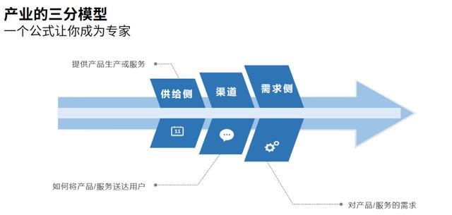 其实在我很早的一篇行研文章里就提到过一个分析方法,这里我对原来的方法论进行了升级,本质上快速搞定一个专业来说就是能了解这个模型:产业的三分模型。