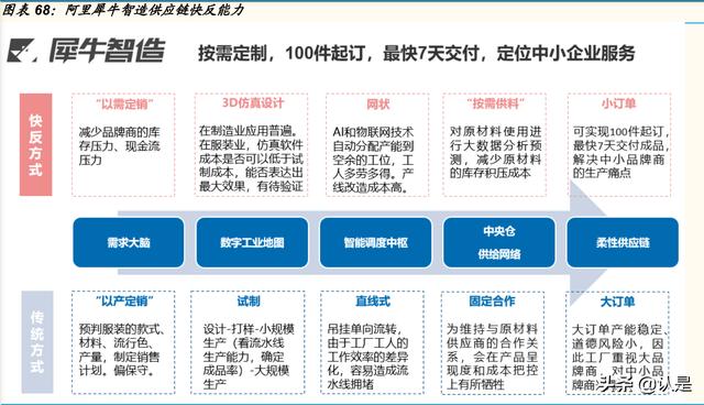 供应链数字化:阿里犀牛智造,按需定制服务中小企业,100 件起订,最 快七天交付 。阿里旗下犀牛智造,通过需求大脑,将服饰行业传统“以产 定销”的模式转变为“以需定销”,减轻企业库存压力和现金流压力;3D 仿真设计替代试制打样环节,智能调度解决流水线拥堵问题,产能自动分 配到多余的工位。该做法面临的产线改造成本、仿真试制的表达效果有待 进一步验证。