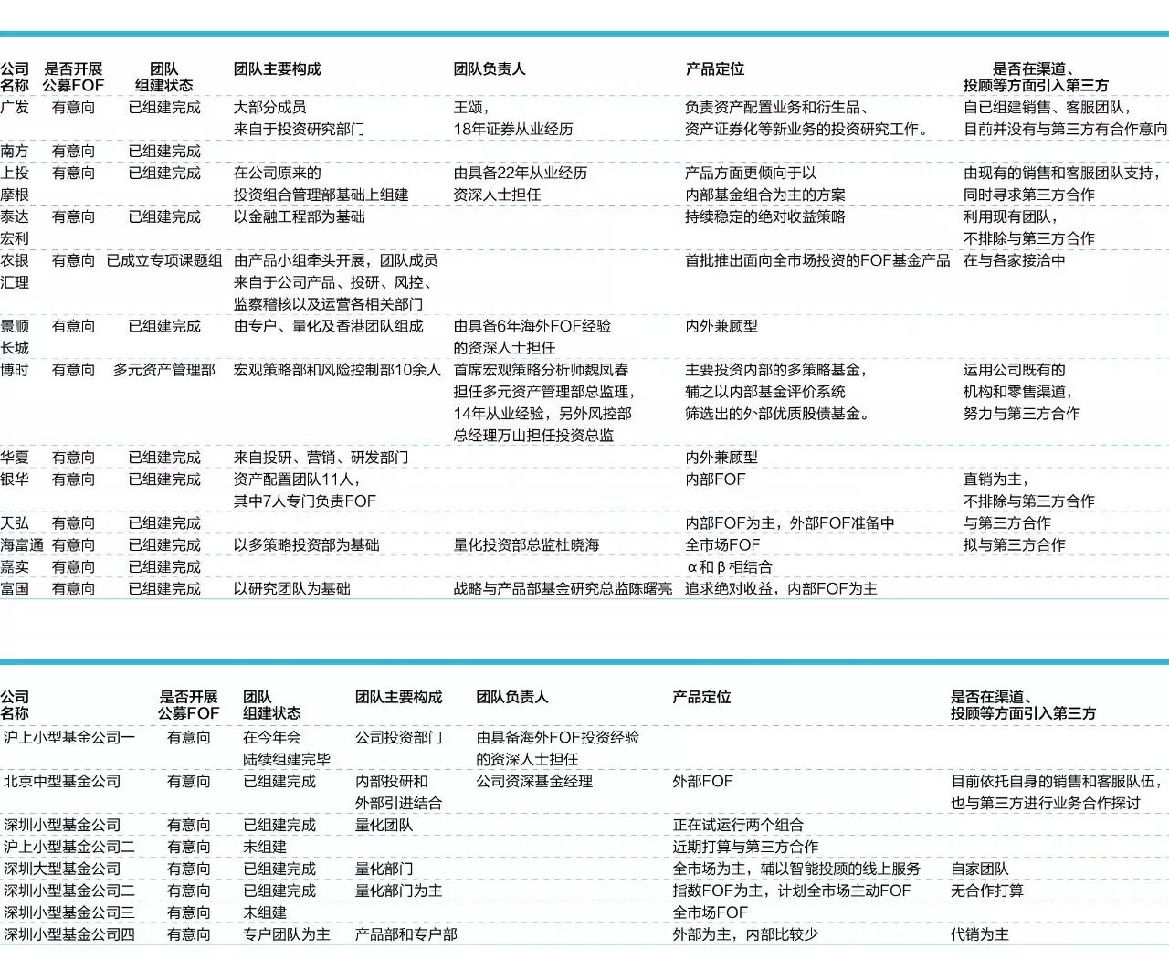 中国基金报记者先后摸底了业内23家基金公司在FOF上的布局,其中仅有两家基金公司表示未打算发行FOF产品,余下21家公司则大多已为FOF首秀做紧密的准备。