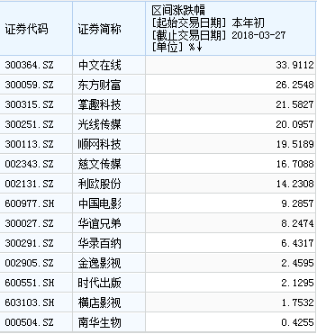从二级市场上看,今年以来,部分文化传媒股已率先开启了一轮不小的攻势。Wind统计显示,截至3月27日收盘,申银万国行业类文化传媒板块中,中文在线(300364)上涨33.91%、光线传媒(300251) 上涨近21%,掌趣科技(300315) 、东方财富(300059) 等涨幅均超过21%。