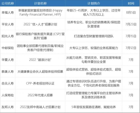 此外,据不完全统计,7月以来,以平安人寿、人保寿险为代表的近9家人寿险企都进一步加大了对高端代理人队伍的培育力度,并出台新一轮代理人优增培育规划。