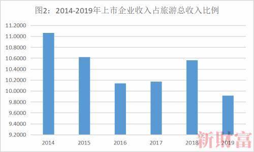 2015-2019年,中国旅游业总收入分别为4.13、4.69、5.4、5.97、6.63万亿元。新财富统计发现,旅游上市企业总收入占当年旅游总收入比例也趋于一致,占比分别为10.62%、10.14%、10.18%、10.57%、9.92%(图2)。