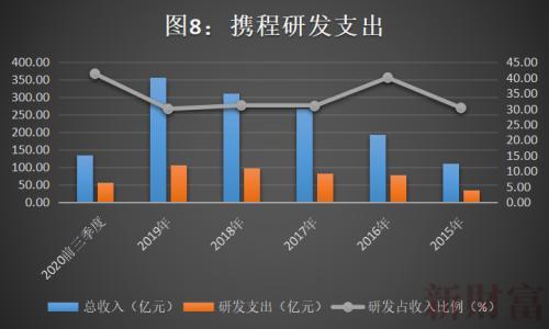 携程过去几年研发费用也水涨船高,占总收入比例平均在三成以上(图8)。这也是携程多年在行业保持领先的必要条件之一。
