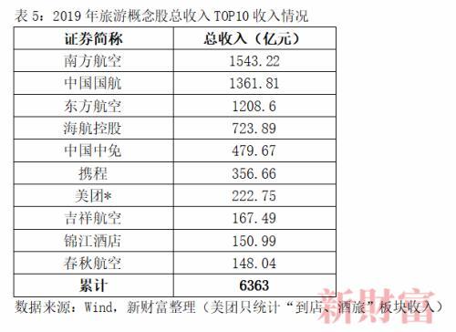 2019年,国内十大旅游概念股总收入6363亿元,占当年国内旅游总收入6.63万亿元大约9.6%(表5)。其中航空公司独占前四,且在TOP10中占有6席,累计收入为5153亿元,拿走大约81%份额,中免、美团、携程、锦江酒店占比不到两成。