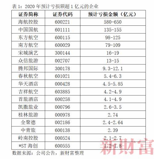 预亏超过1亿元的企业共有17家。6家航司预亏,三大央企国航、东航、南航受损很严重,亏损金额在百亿元上下;吉祥航空、春秋航空总亏损额相对较小,但也在5亿元左右(表1)。