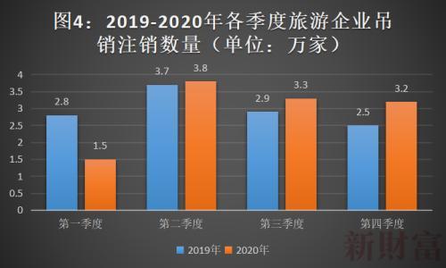 值得注意的是,从2020年二季度开始,旅游吊注销企业的同比增长率逐季攀升。二季度比上年同期吊注销多1000家,三季度多4000家,四季度则多7000家(图4)。