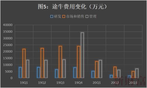 持续亏损的途牛,业务以出境跟团游为主,受到疫情打击很重,减费用更加明显。2020年前三季度,途牛研发、市场销售和管理三项费用总计6.11亿元,同比减少大约54%(图5)。费用变化暗示途牛在不断减员。途牛2019年报显示,员工总数为6188人,有途牛内部人士透露,员工已经降至2000人以下,三个人中有两人离开。